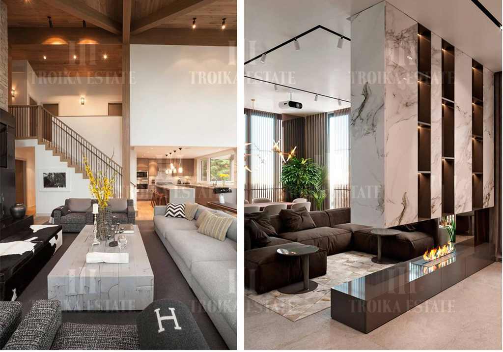 камином. Панорамные окна гостиной выходят на юго-восток и смотрят на стильные