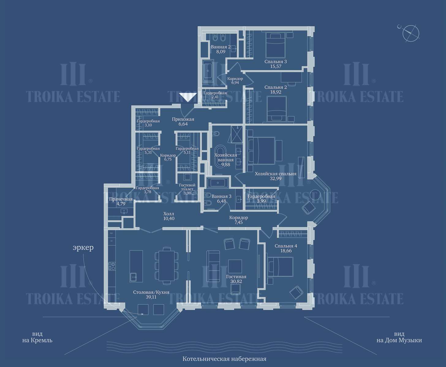 Предлагается видовая многокомнатная квартира в состоянии shell&core. Планировочное решение функционально разделяет квартиру на гостевую и приватную зоны. В приватной части спланированы четыре спальни с гардеробными и ванными комнатами. В большой спальне панорамное эркерное окно в сторону набережной и выделенная рабочая зона. В гостевой части расположены гостиная с эркерным окном в сторону Кремля и набережной, а также кабинет с видом на набережную. По желанию покупателя возможна реализация интерьерной отделки под ключ. В стоимость квартиры включены 2 машиноместа и кладовая.