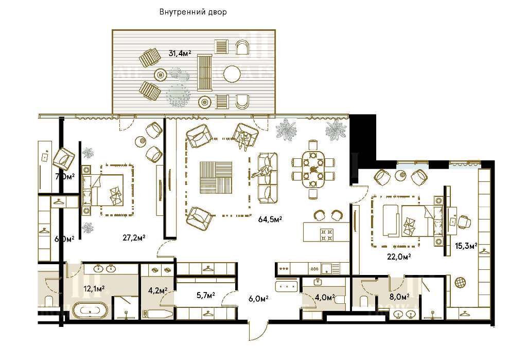 Сервисная резиденция отеля Метрополь с просторной террасой, выходящей на внутренний двор-сад. Резиденция предлагается с дизайнерской отделкой от Пьеро Лиссони. Функциональная планировка позволяет разместить две изолированные спальни, каждая со своим кабинетом, гардеробной и ванной комнатой, гостиную-кухню-столовую с выходом на террасу, постирочную, гостевой санузел. Клубная