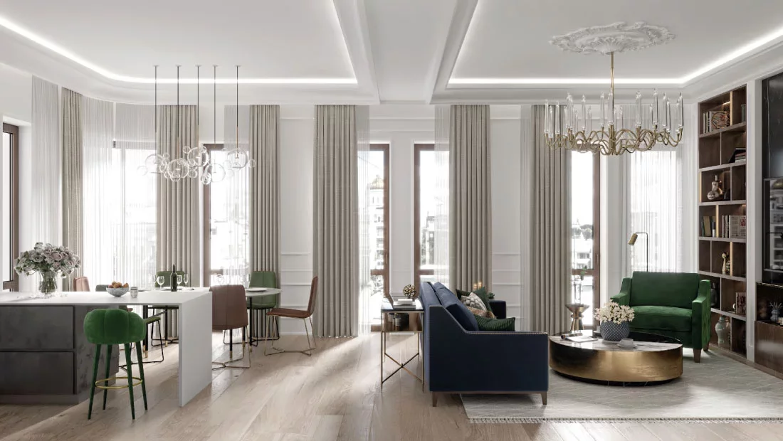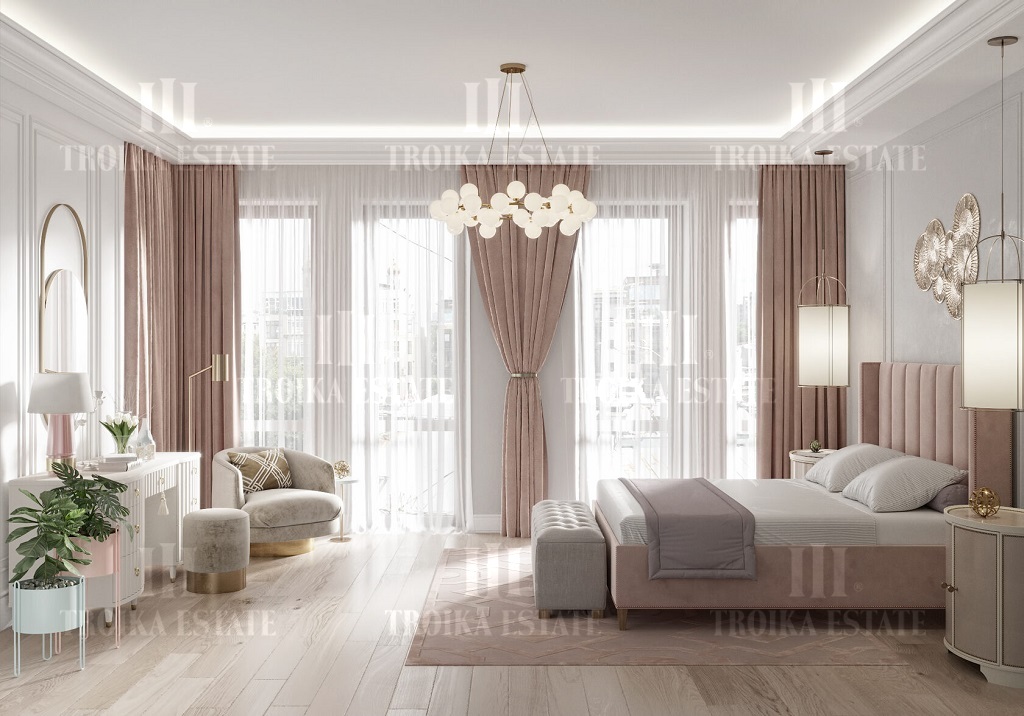 Четырехкомнатная квартира в элитном комплексе особняков. Предчистовая отделка white box. Планировочное решение включает просторную, светлую гостиную с зоной кухни-столовой,