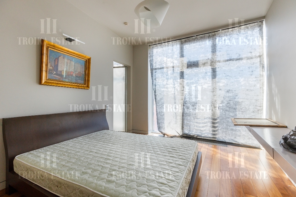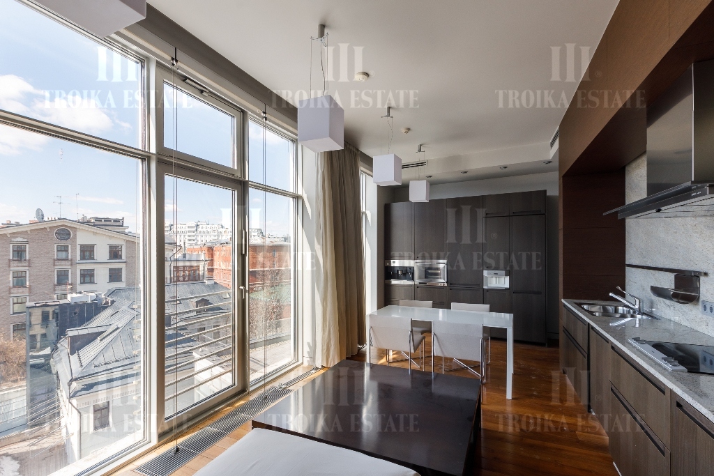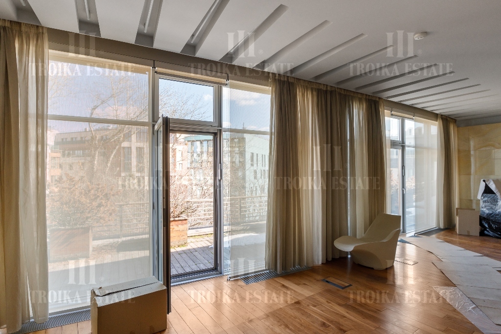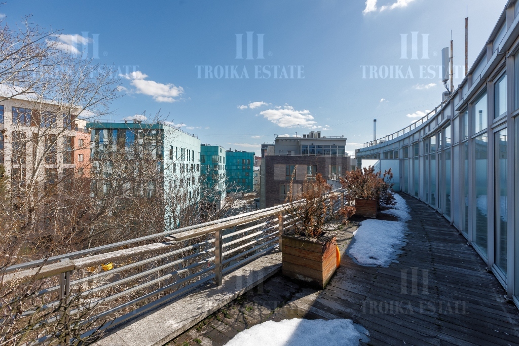 Пентхаус с видовой террасой в малоэтажном современном особняке в центре Москвы. Выполнена отделка, требующая обновления. Пентхаус занимает весь этаж, лифт приходит персонально в квартиру. Предусмотрено 2 м/м в подземном паркинге. Планировочное решение функционально выделяет гостевую и приватную зоны. Просторная гостиная соединена с кабинетом и кухней-столовой. В кабинете установлен действующий камин. Кухня полностью оборудована мебелью и бытовой техникой, предусмотрена система очистки воды. Приватная зона отделена коридором, здесь находятся три спальни, каждая со своей гардеробной и ванной комнатой, а также хозяйственные комнаты. Еще одна гардеробная и гостевой санузел расположены при входе. Из гостиной, кабинета и мастер-спальни выход на большую террасу с живописными видами.