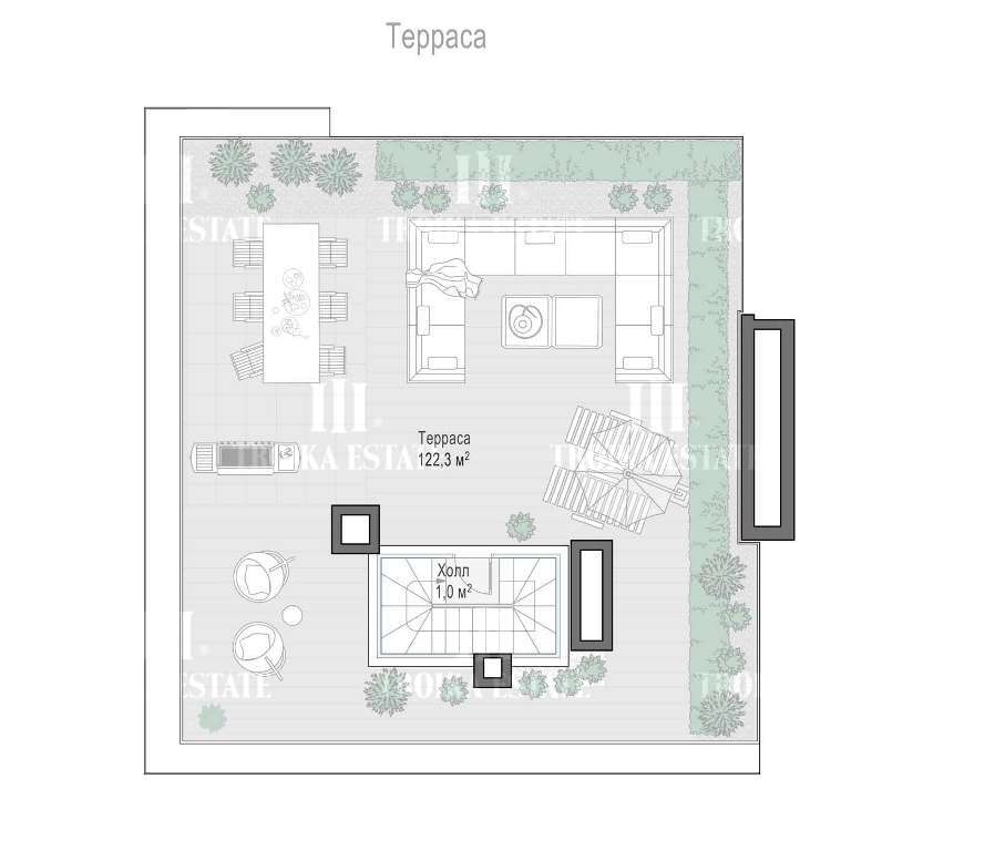 патио на улице, террасу на кровле с зоной барбекю, дровяной камин. Здесь