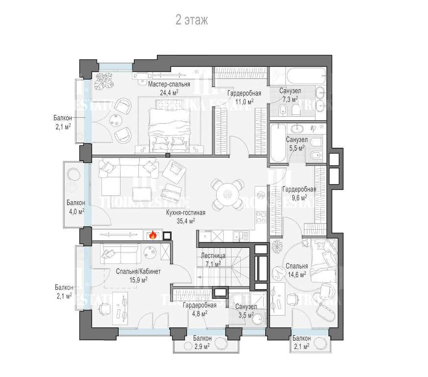 спланированы три спальни, гостиная, 4 санузла, постирочная, 5 балконов.