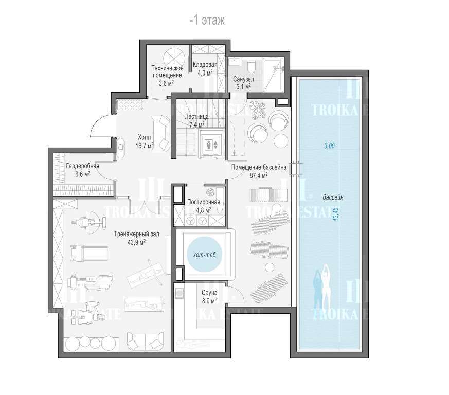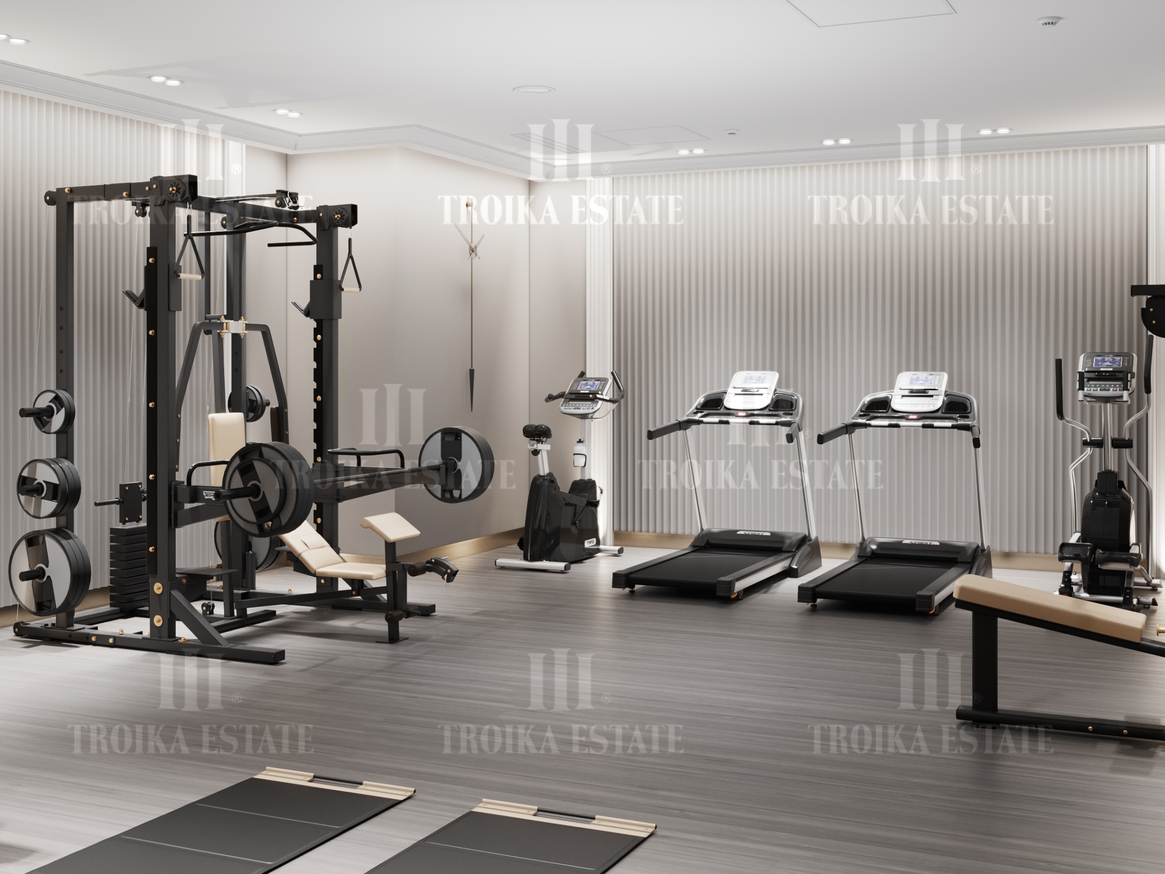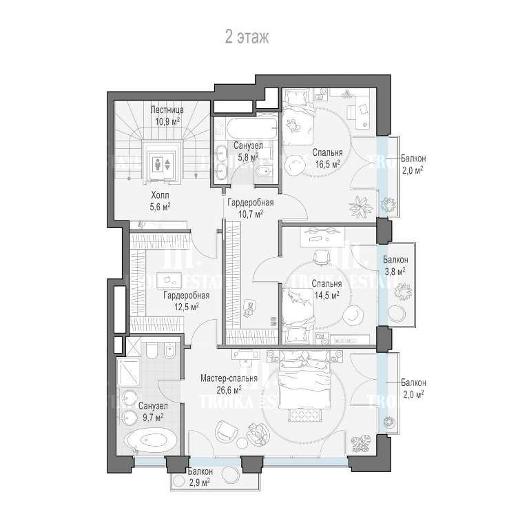 спланированы 4 спальни с санузлами, гостиная, постирочная, 4 балкона, спортзал, спа-зона с бассейном.
