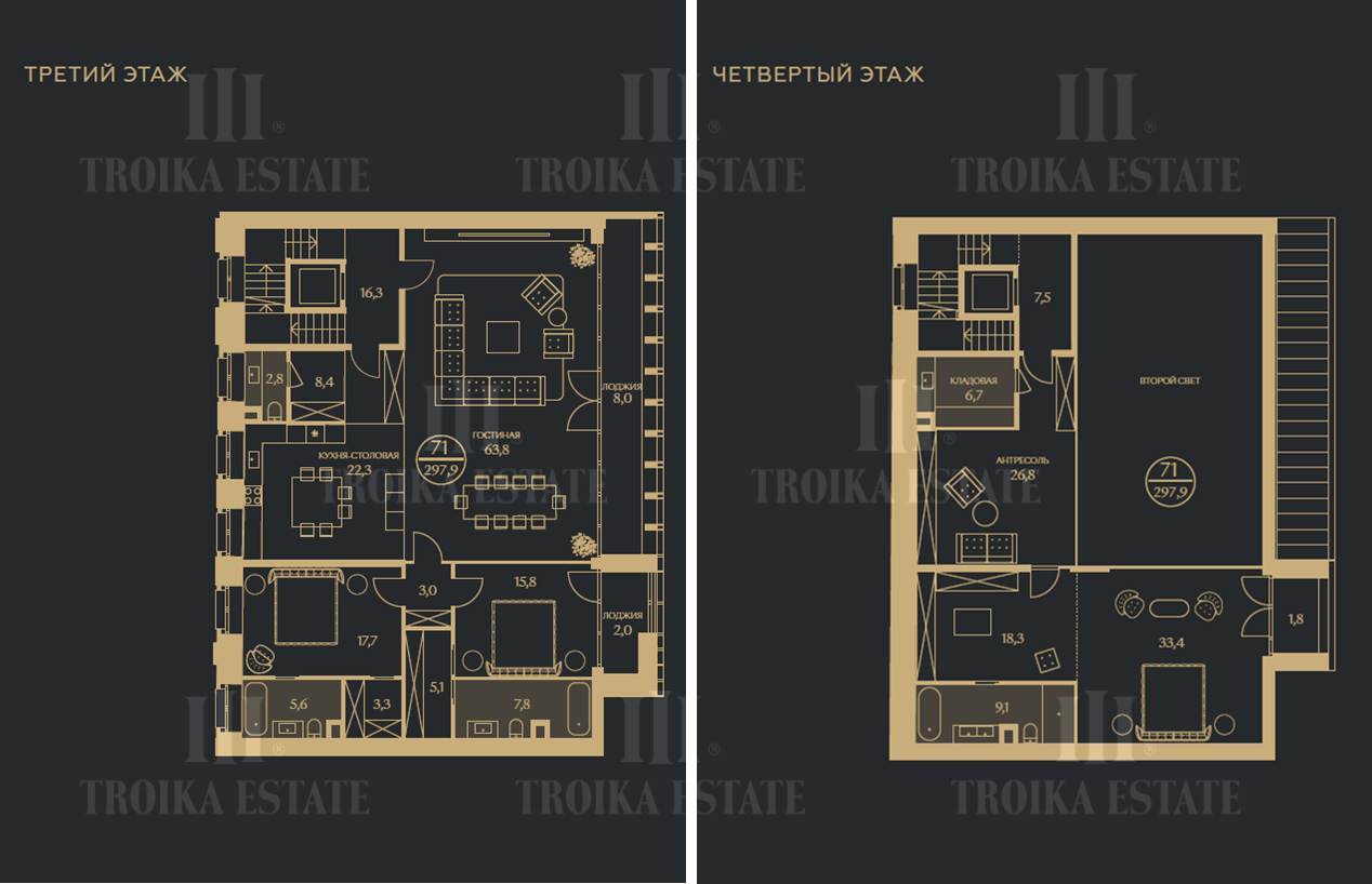 гостиную с выходом на закрытую террасу, кухню-столовую и две спальни с ванными комнатами. Панорамное остекление первого уровня достигает высоты 4 метра. Второй уровень с двускатной крышей и мансардными окнами. Здесь спланирована еще одна спальня с санузлом и кабинет. Есть возможность присоединения двух нижних этажей. Особняк с отдельным входом общей площадью 600 кв.м. расположен на