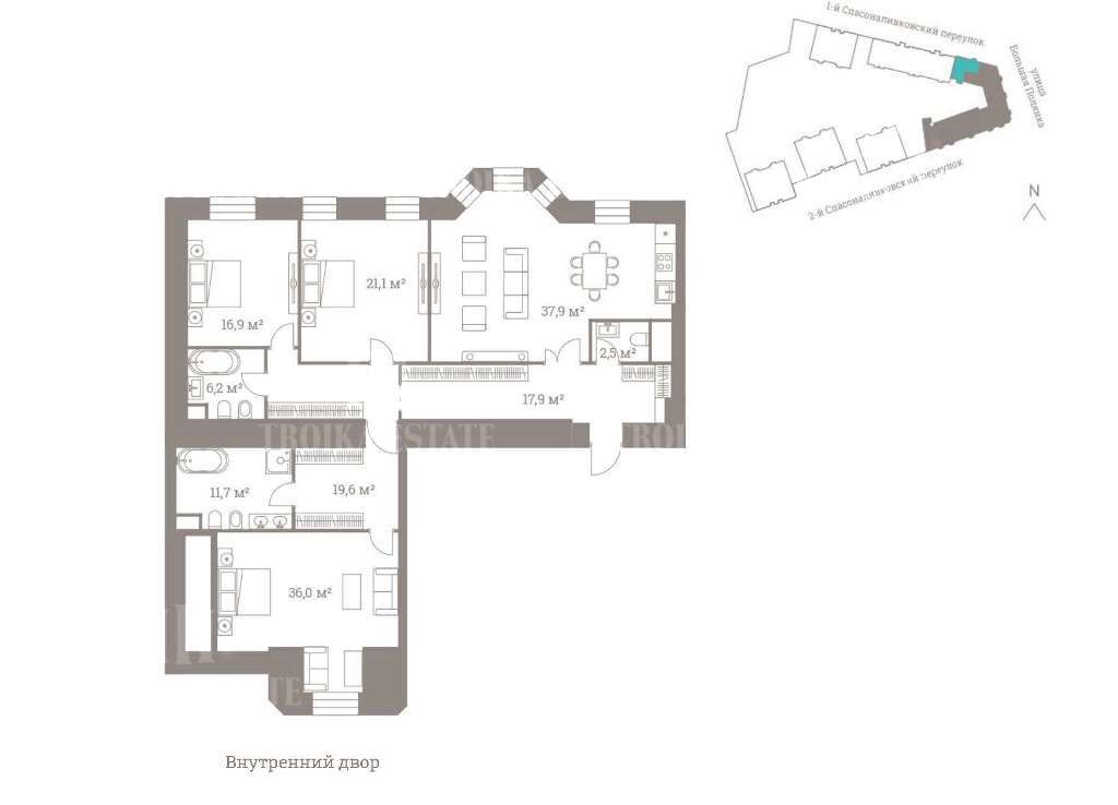 спальни, три санузла, большую зону гостиной с кухней. Здание бывшего доходного
