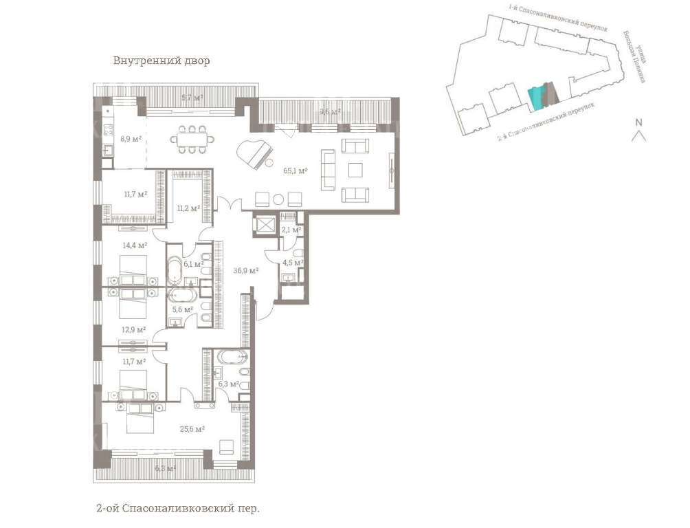 включает большую зону гостиной с кухней, 4 спальни с гардеробными, 4 санузла.