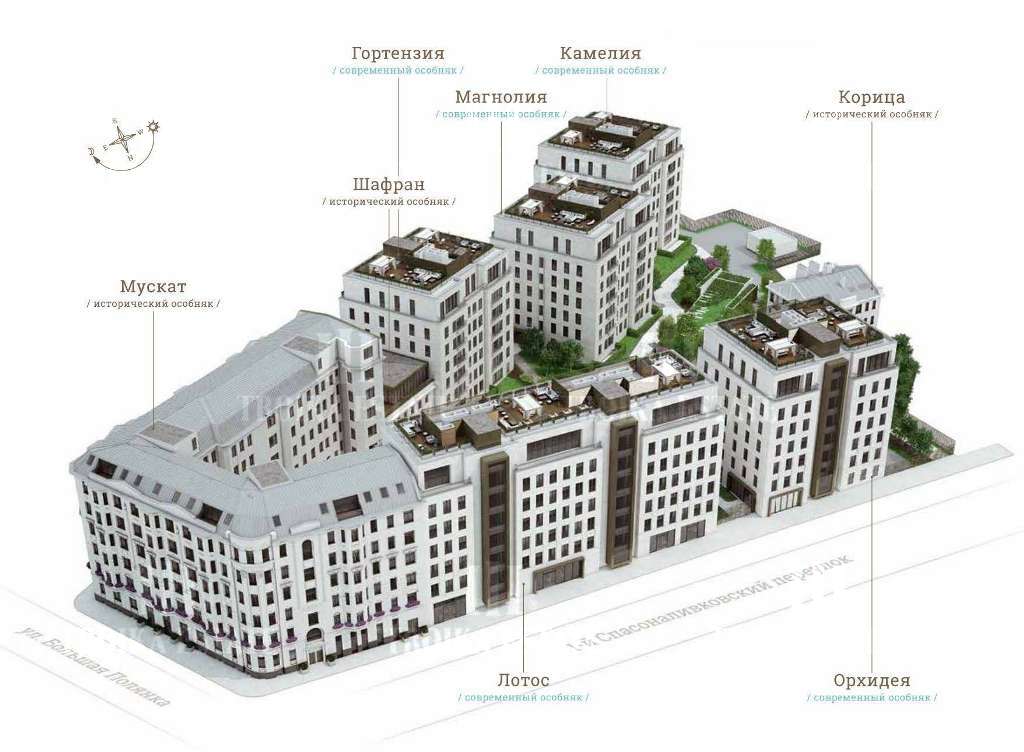 комплекс из 8-ми особняков Полянка / 44 имеет общий закрытый двор-сад.