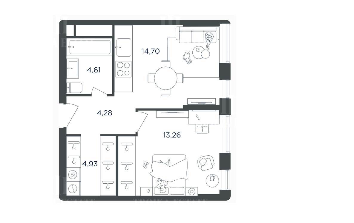 кухней-гостиной, совмещенный санузел, гардеробная при входе. Расположена на