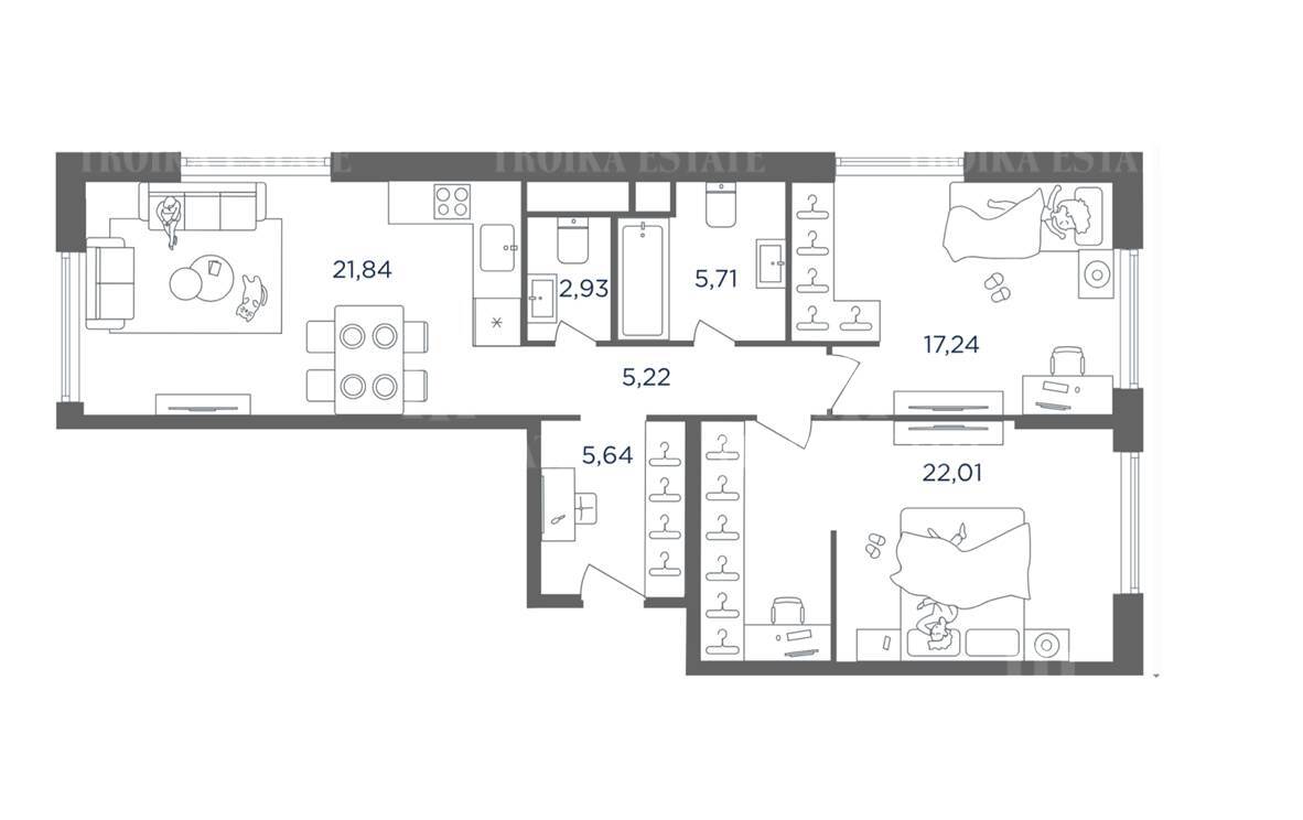 выходят на три стороны. Планировочное решение предусматривает 2 спальни, 2