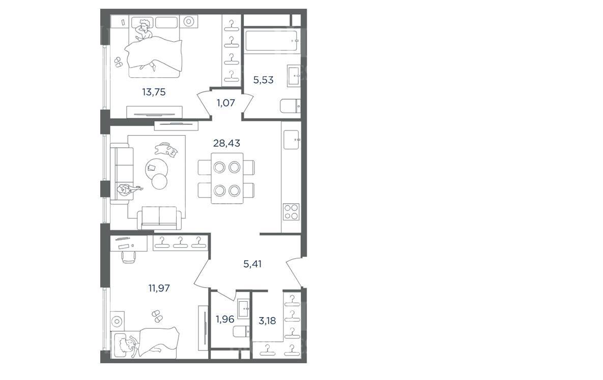 планировкой, предусматривающей 2 спальни, два санузла, гостевую зону с кухней,