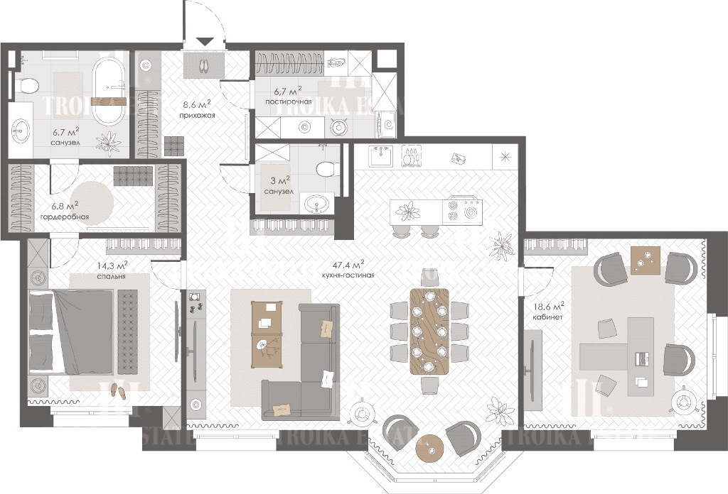 Предлагается под отделку. Свободно планируются мастер-спальня с ванной комнатой