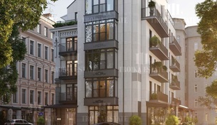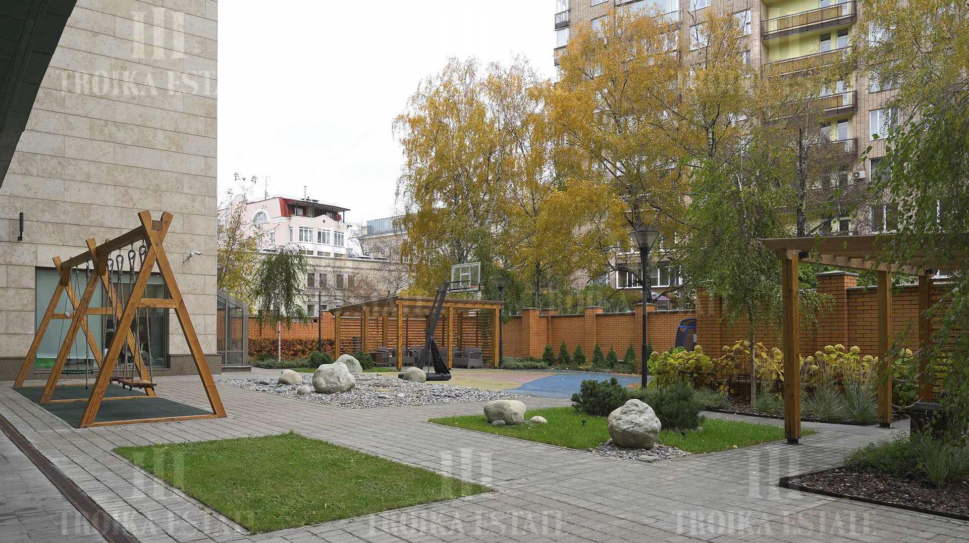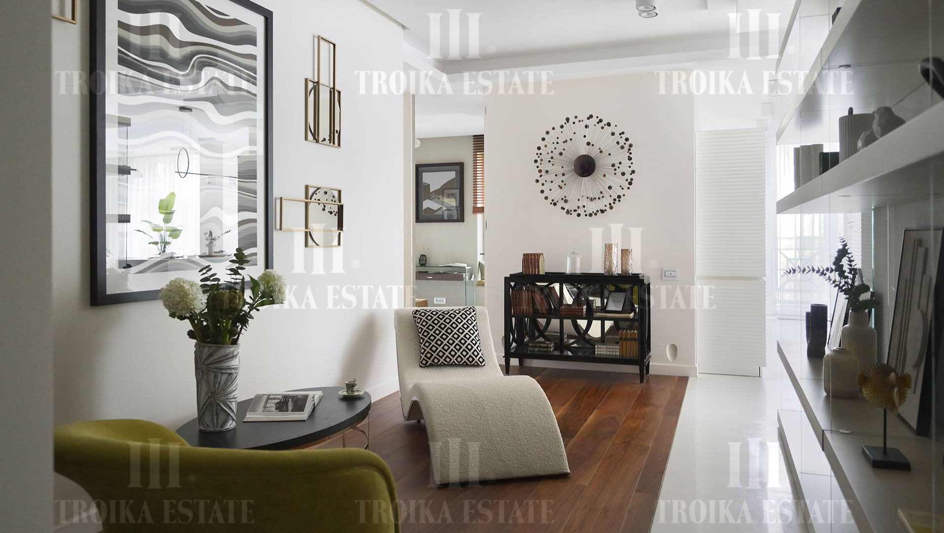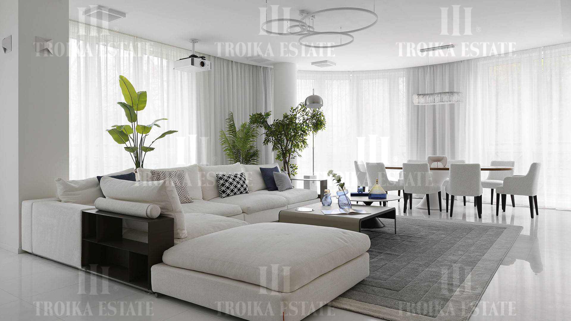 Спланирована большая гостиная с зоной отдыха с итальянскими диванами и домашним кинотеатром. Обеденная зона на 8 персон с декоративной стеной «ракушечник» Grassipietre. Кухня с островом и встроенной техникой Miele. В холле организована зона библиотеки. Окна выходят во двор и пешеходный переулок. Мастер-спальня со своей ванной комнатой с окном, отдельной ванной, душем и двумя раковинами. Установлена акустическая система на 2 зоны. Санузел отделан мозаикой из травертина, итальянская сантехника. Вторая спальня или кабинет с выходом на балкон и со своим санузлом. Прихожая с вместительной гардеробной, хозяйственным помещением, и гостевым санузлом с мраморными белыми полами. В паркинге есть 2 машиноместа.