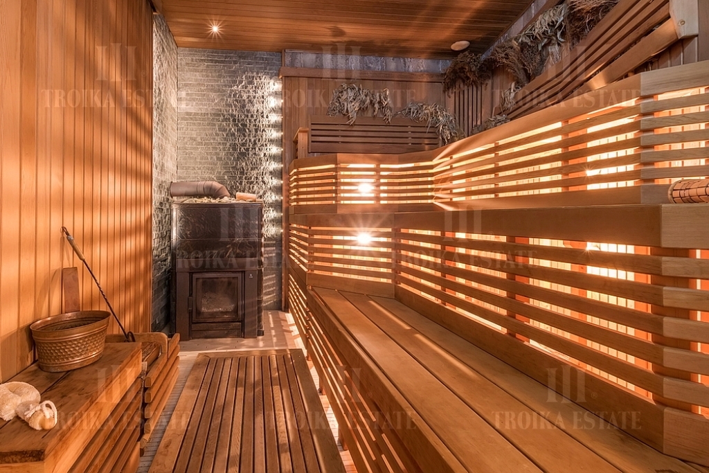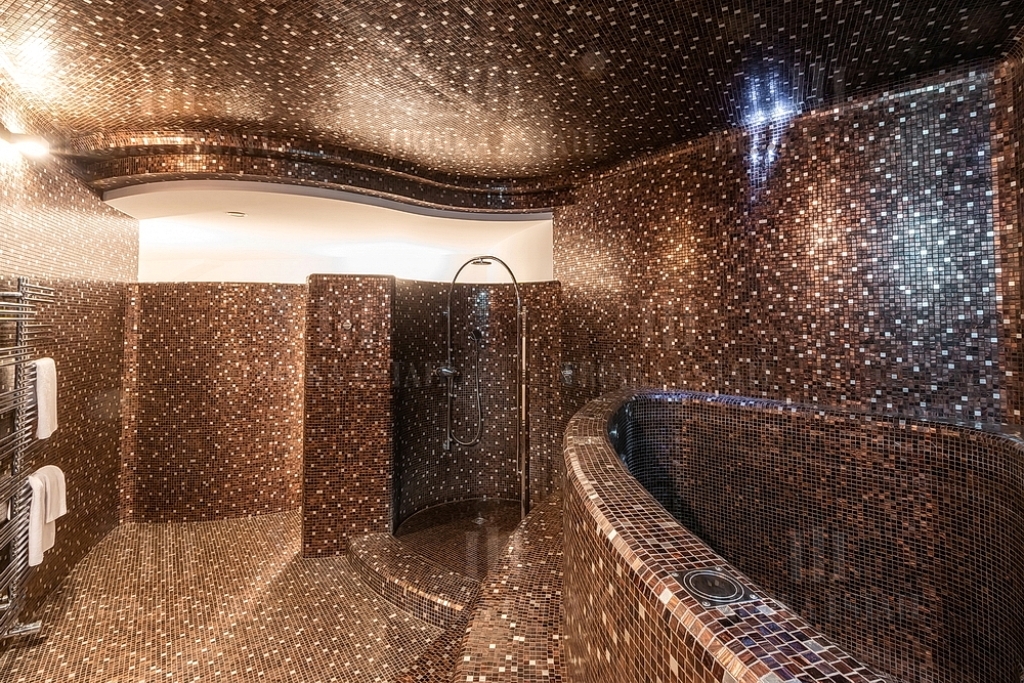 цокольном этаже винный погреб. На первом этаже бассейн, паровые кабины,