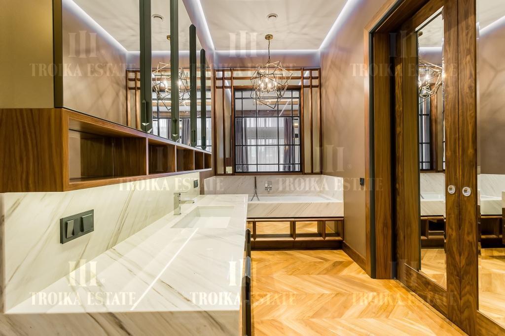 отделке использованы натуральные дорогие материалы: камень, дерево, стекло.