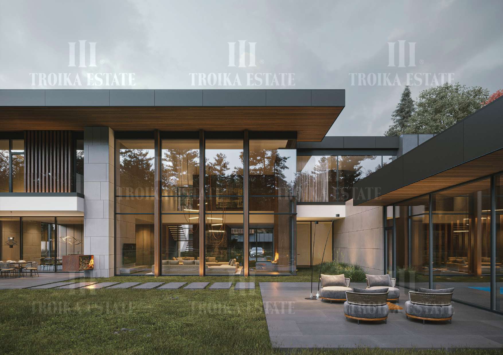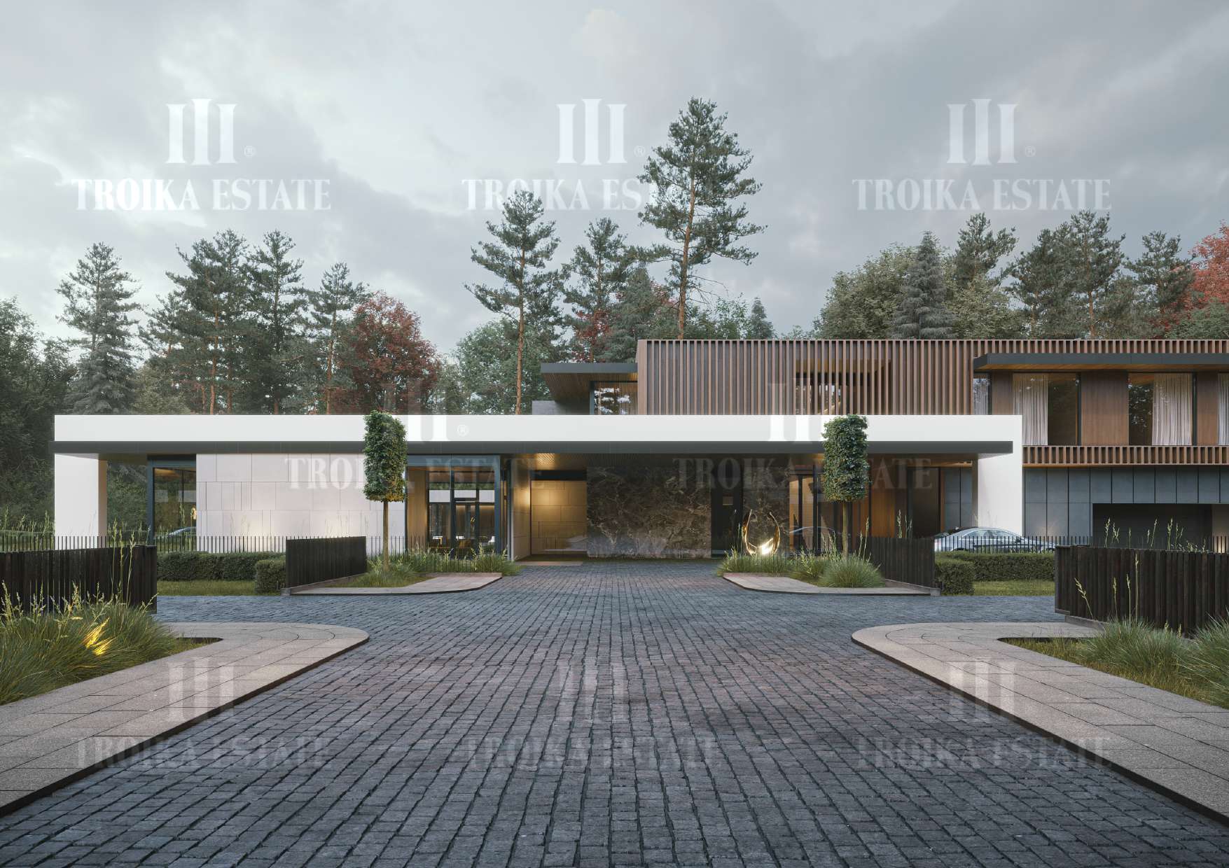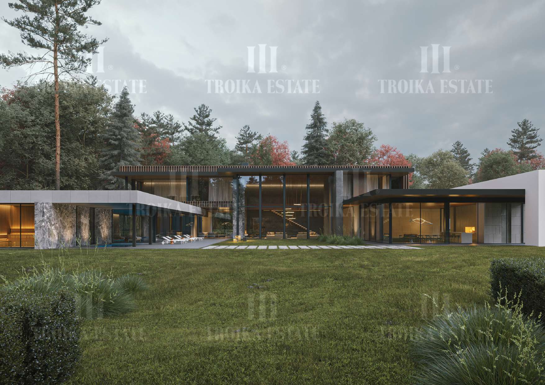 ванными комнатами, просторную двухсветную гостиную, SPA зону с бассейном и банями, паркинг на 5 м/м, комнаты для персонала. Большой участок позволяет создать уникальное ландшафтное оформление.