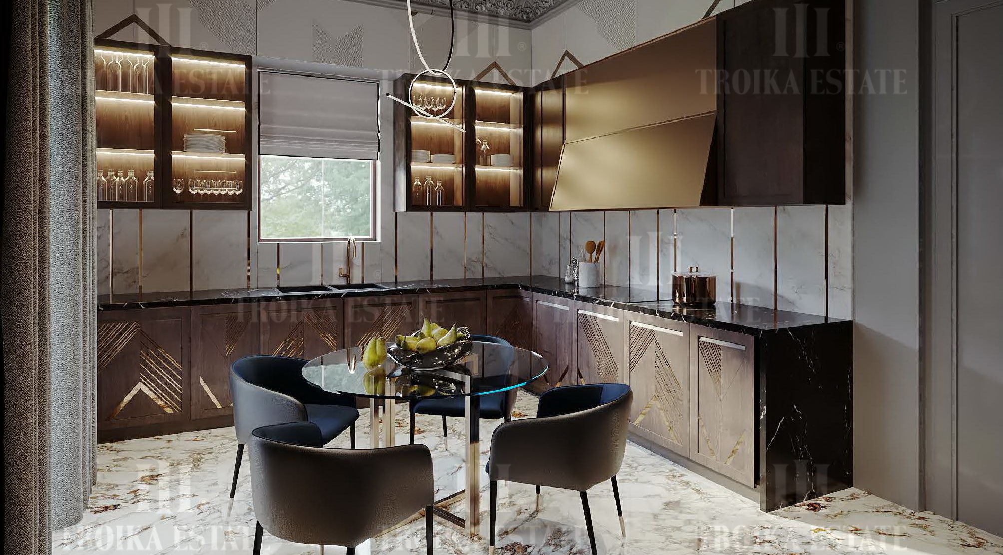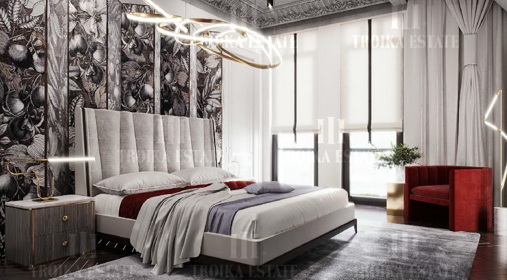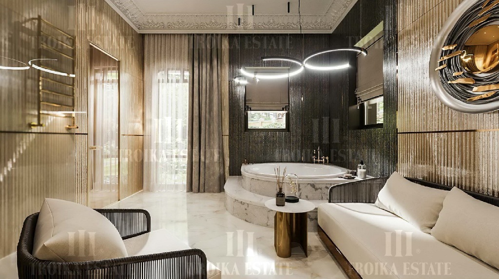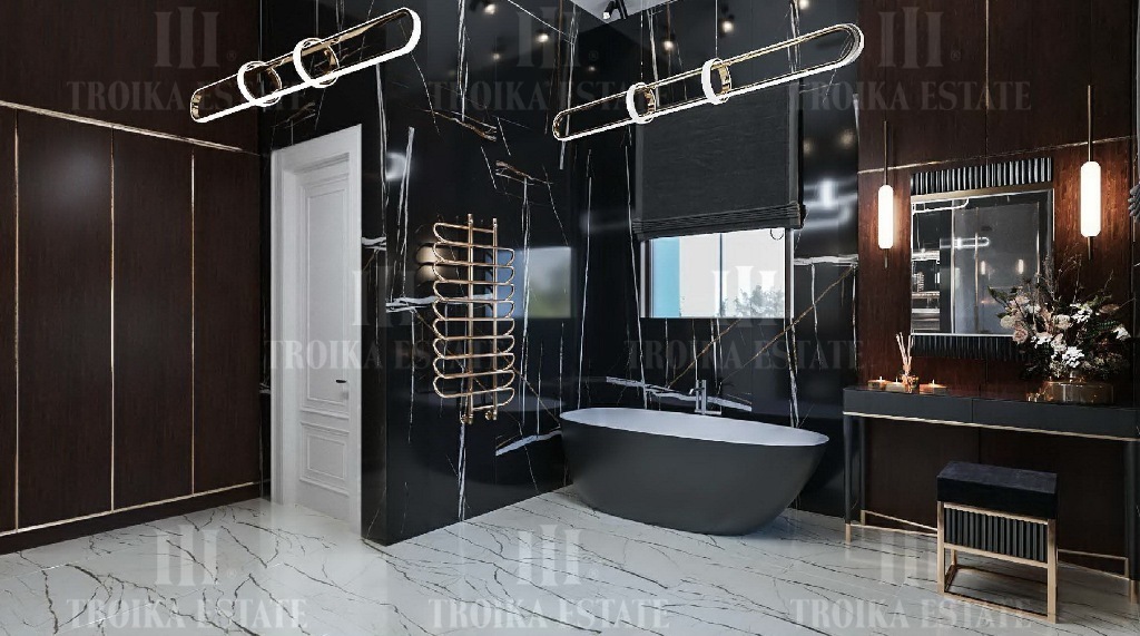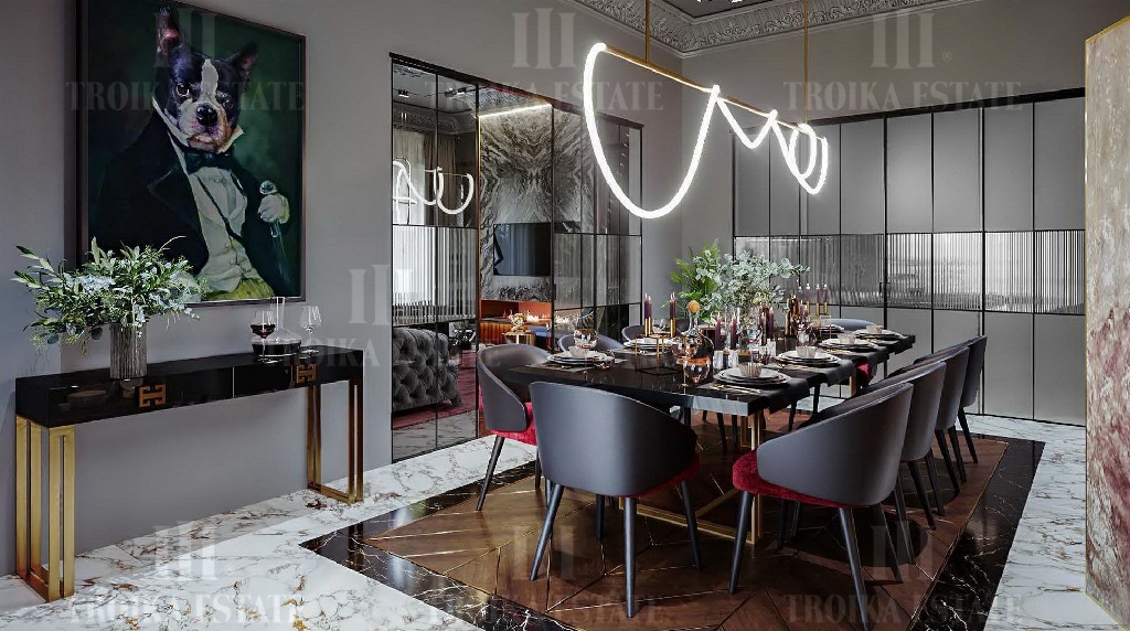 современном стиле. Планировкой предусмотрена гостиная, каминный зал, столовая,