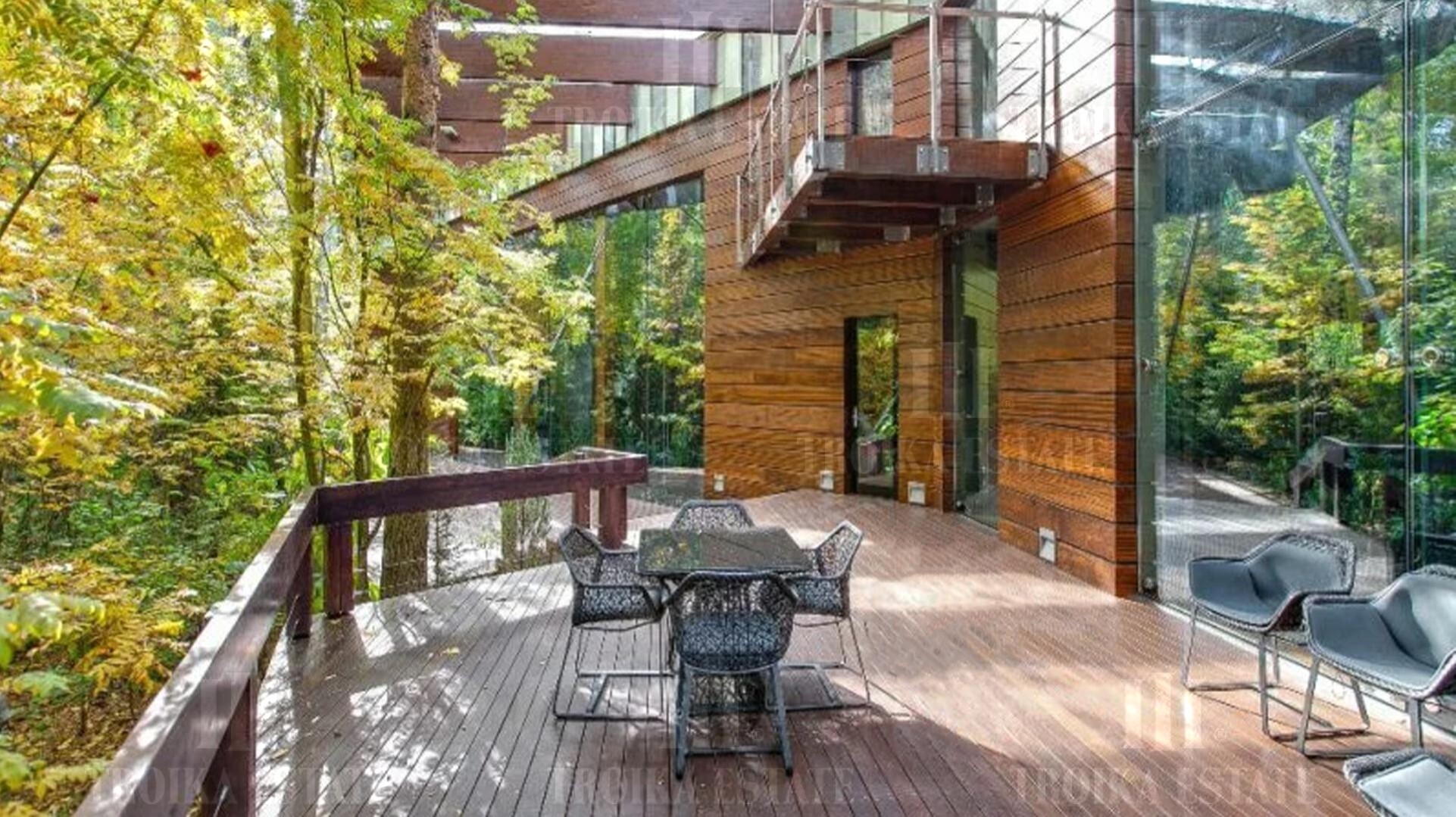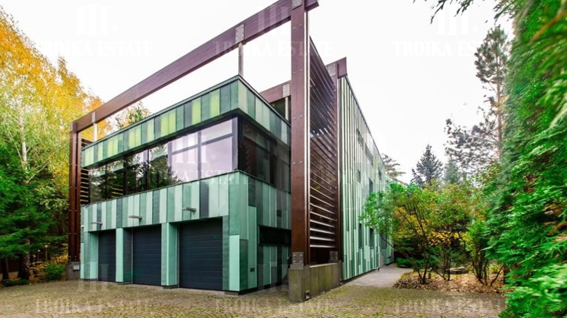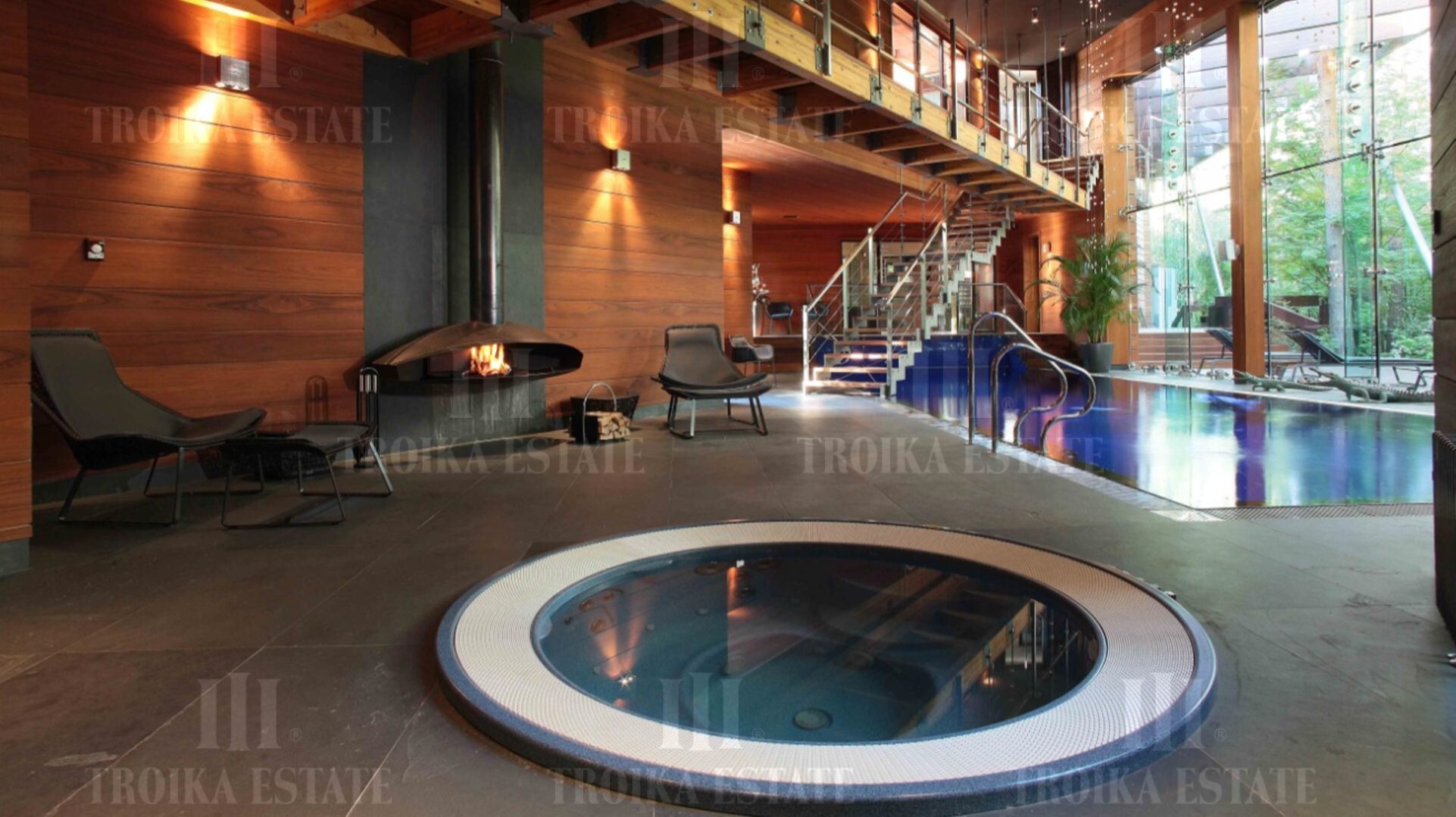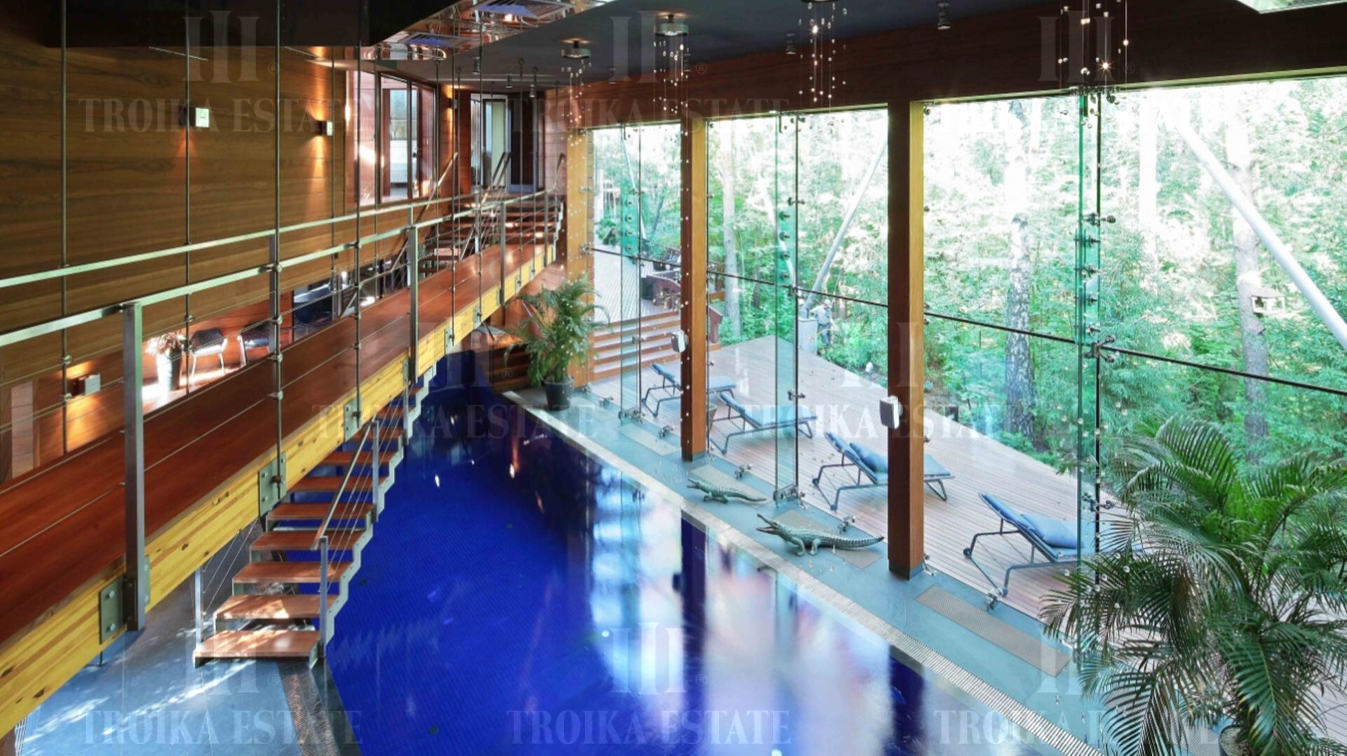 Лесная загородная резиденция в стиле «хай-тек» с интерьером от Ольги Фрейман. Дом с панорамным остеклением и вторым светом расположен на участке с лесными деревьями. В цокольный этаж встроен гараж для 3 машин. По периметру дома расположены уютные террасы. Интерьер выполнен с применением натуральных пород камня и дерева. Дом полностью меблирован из дизайнерских коллекций. Установлена кухня Riva. Стол Minotti, стулья Giorgetti, люстра De Majo. Жилое пространство дома состоит из 5-ти спален с ванными комнатами, кабинета, гостиной с вторым светом, кухни, столовой. Кроме того есть много функциональных помещений - кинотеатр, спортзал, тир для пневмооружия, винная комната, постирочная с санузлом, котельная, 2-х комнатная квартира персонала с отдельным входом. Главная особенность дома — двухуровневая спа-зона с бассейном и сауной.