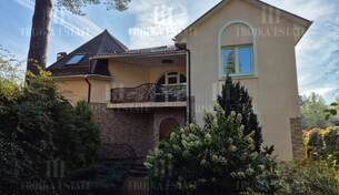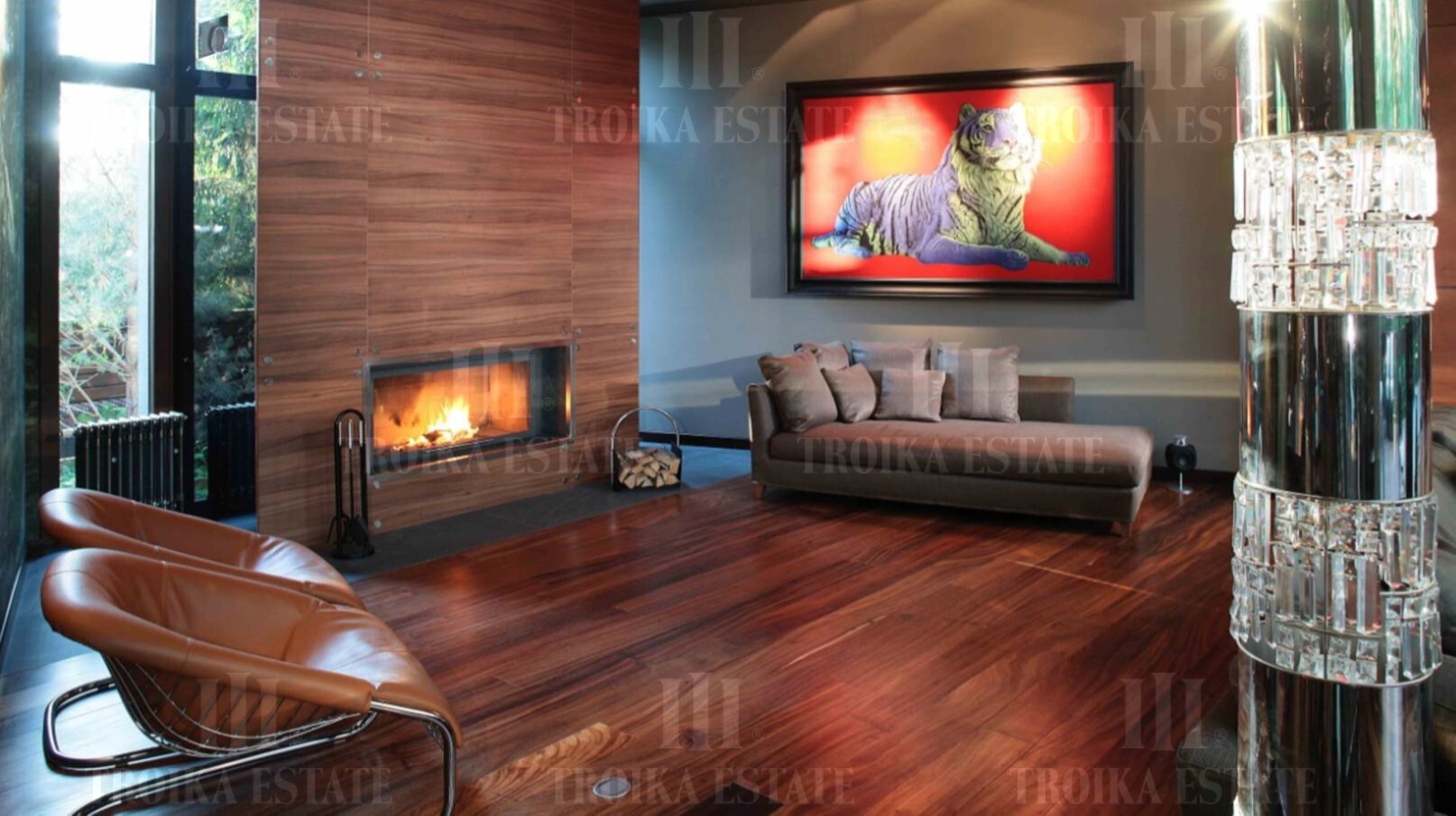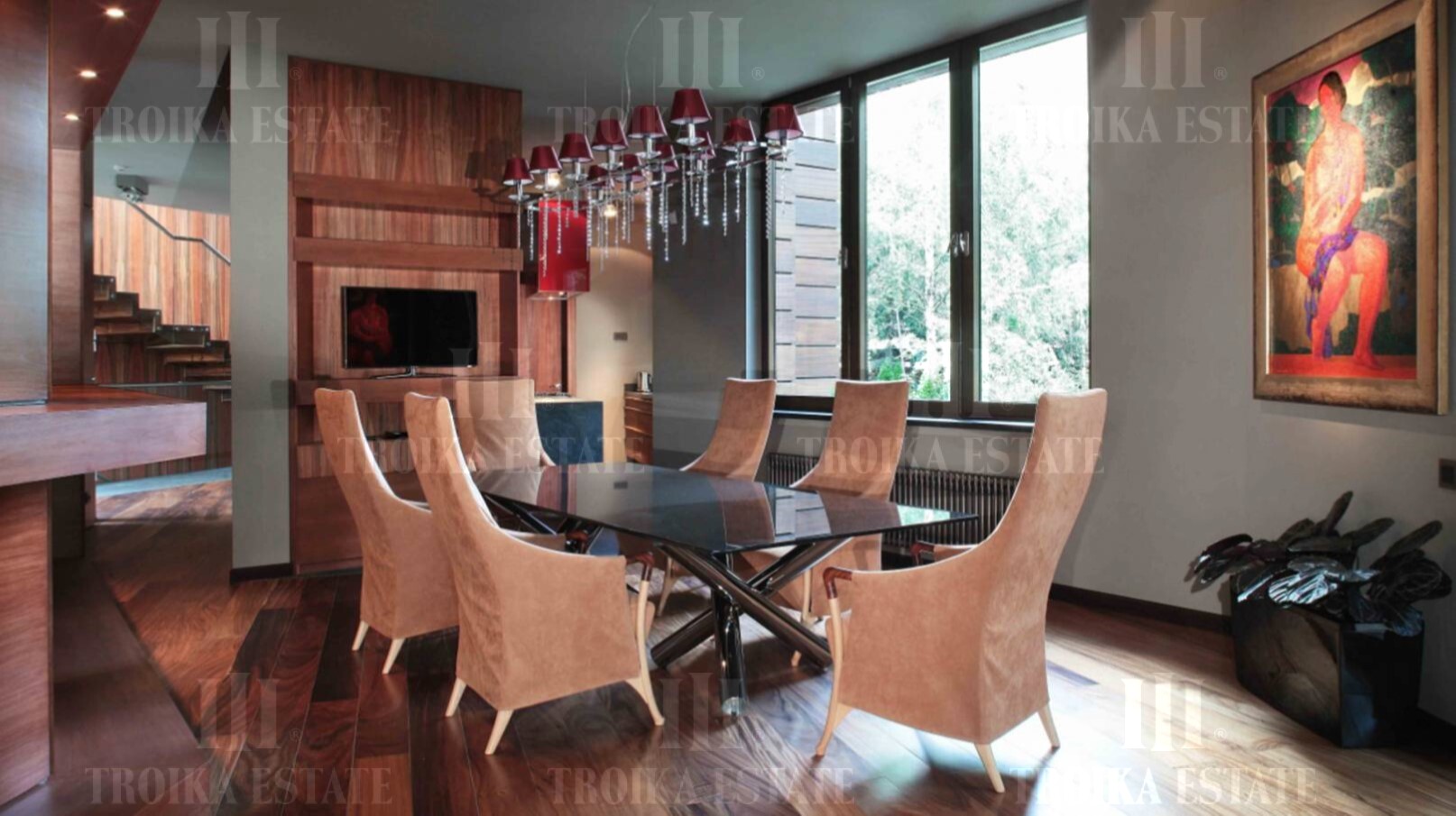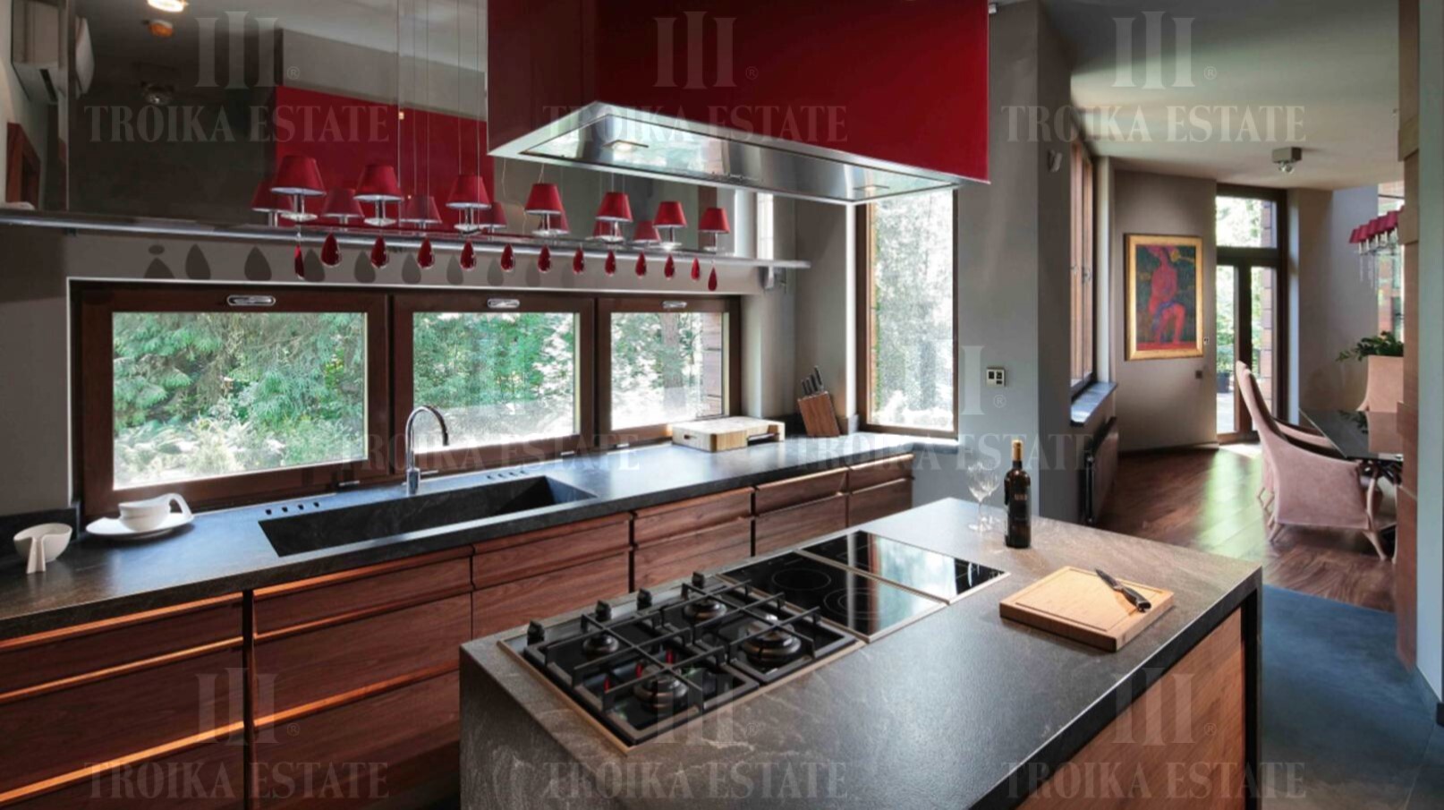 Лесная загородная резиденция в стиле «хай-тек» с интерьером от Ольги Фрейман. Дом с панорамным остеклением и вторым светом расположен на участке с лесными деревьями. В цокольный этаж встроен гараж для 3 машин. По периметру дома расположены уютные террасы. Интерьер выполнен с применением натуральных пород камня и дерева. Дом полностью меблирован из дизайнерских коллекций. Установлена кухня Riva. Стол Minotti, стулья Giorgetti, люстра De Majo. Жилое пространство дома состоит из 5-ти спален с ванными комнатами, кабинета, гостиной с вторым светом, кухни, столовой. Кроме того есть много функциональных помещений - кинотеатр, спортзал, тир для пневмооружия, винная комната, постирочная с санузлом, котельная, 2-х комнатная квартира персонала с отдельным входом. Главная особенность дома — двухуровневая спа-зона с бассейном и сауной.