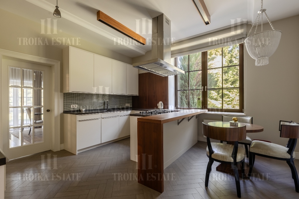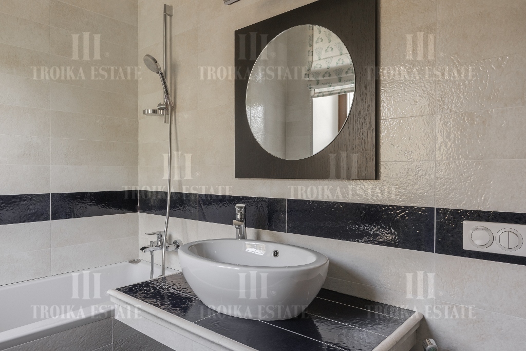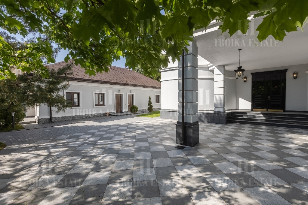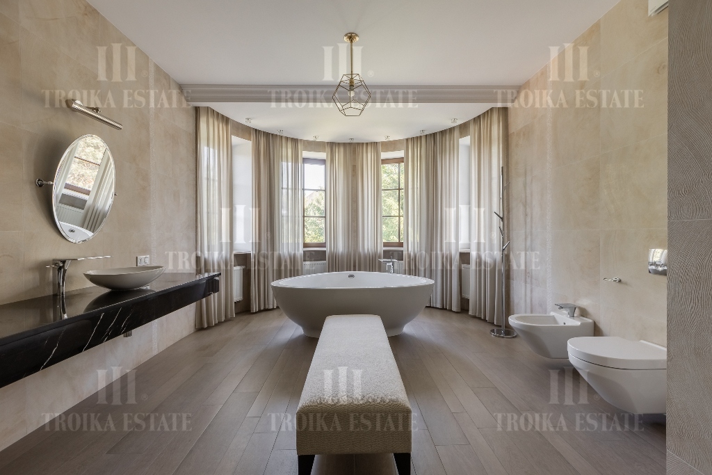 с ванными и гардеробными, кабинет. Отдельно на участке гостевой дом с блоком для персонала и гаражом на 2 м/м. На аккуратном участке выполнено благоустройство с мощенными дорожками, освещением и декоративными насаждениями. Подведен высокоскоростной интернет. Все коммуникации центральные. Дом находится в одном из