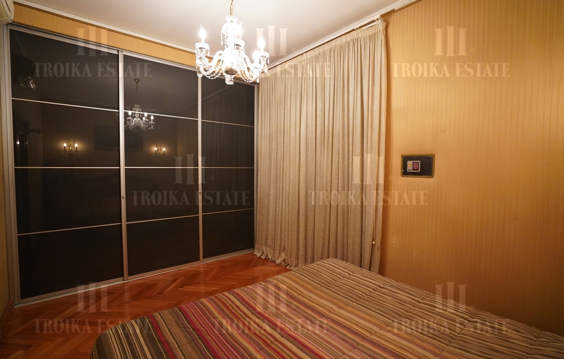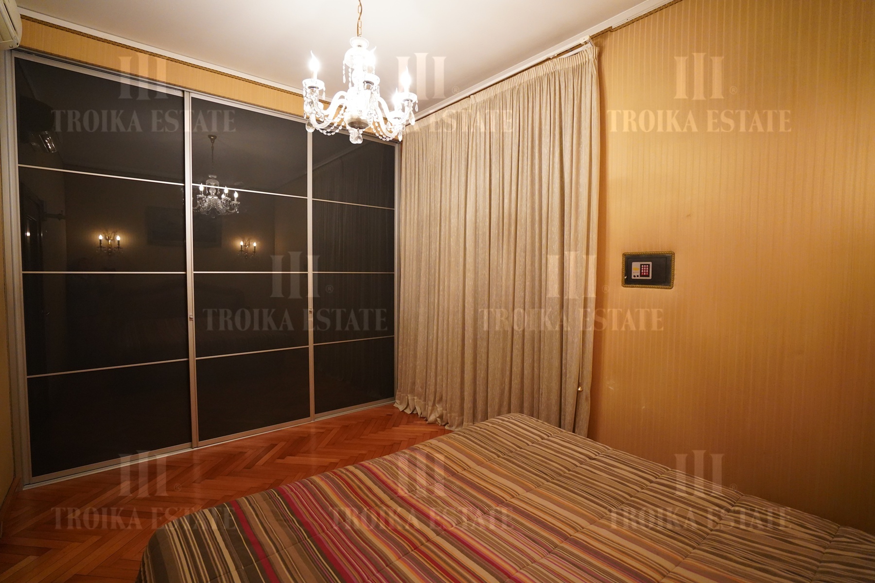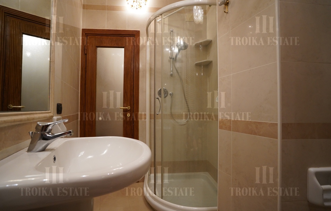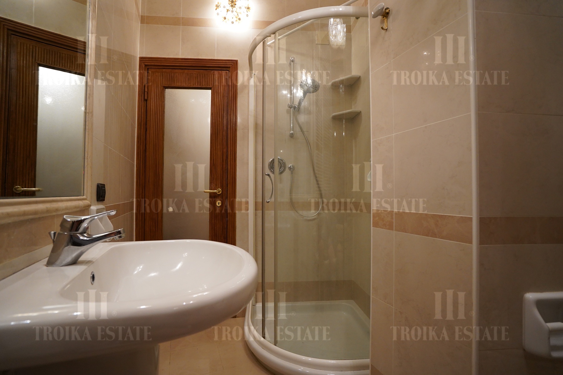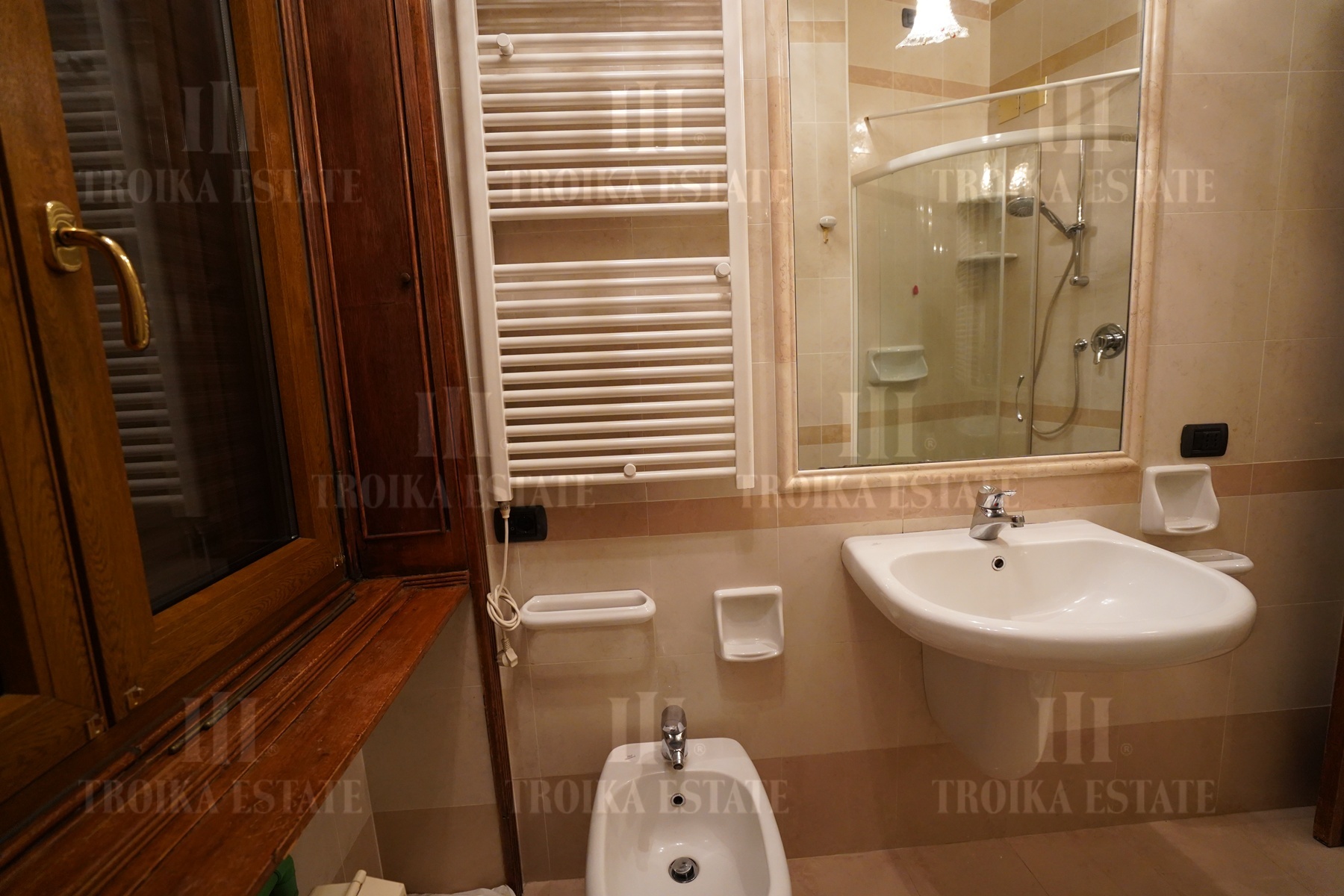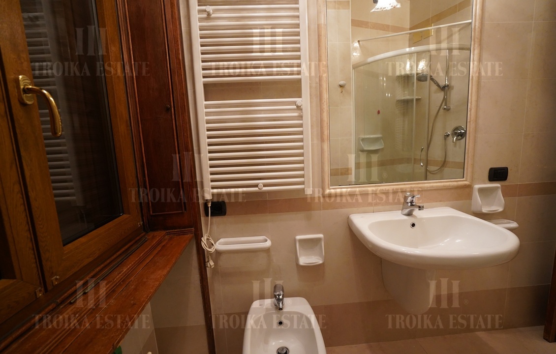 Планировка включает гостиную, спальню, столовую с кухней, гардеробную, ванную комнату с душем, прихожую и холл. Все комнаты изолированы. Апартаменты полностью обставлены эксклюзивной мебелью производителей Treca, Rimadesio, Salvarani, Natuzzi. Для придания особой элегантности и ценности использованы антикварные вещи, хрустальные люстры и канделябры из позолоченной бронзы, антикварный камин из полудрагоценного камня, антикварные зеркала в золотых рамках, кожаные диваны. Стены в гостиной и спальне обтянуты дорогими тканями Haas. Столовая-кухня обставлена мебелью Salvarani, выполненной по заказу, и оборудована немецкой техникой Miele, включая стиральную и осушительную машины, холодильник, духовку, вытяжку и т.д. Ванная комната с душем имеет большое окно, стены и пол сделаны из мрамора фирмы Graniti Fiandre. *Имеется также гараж, который продаётся отдельно.